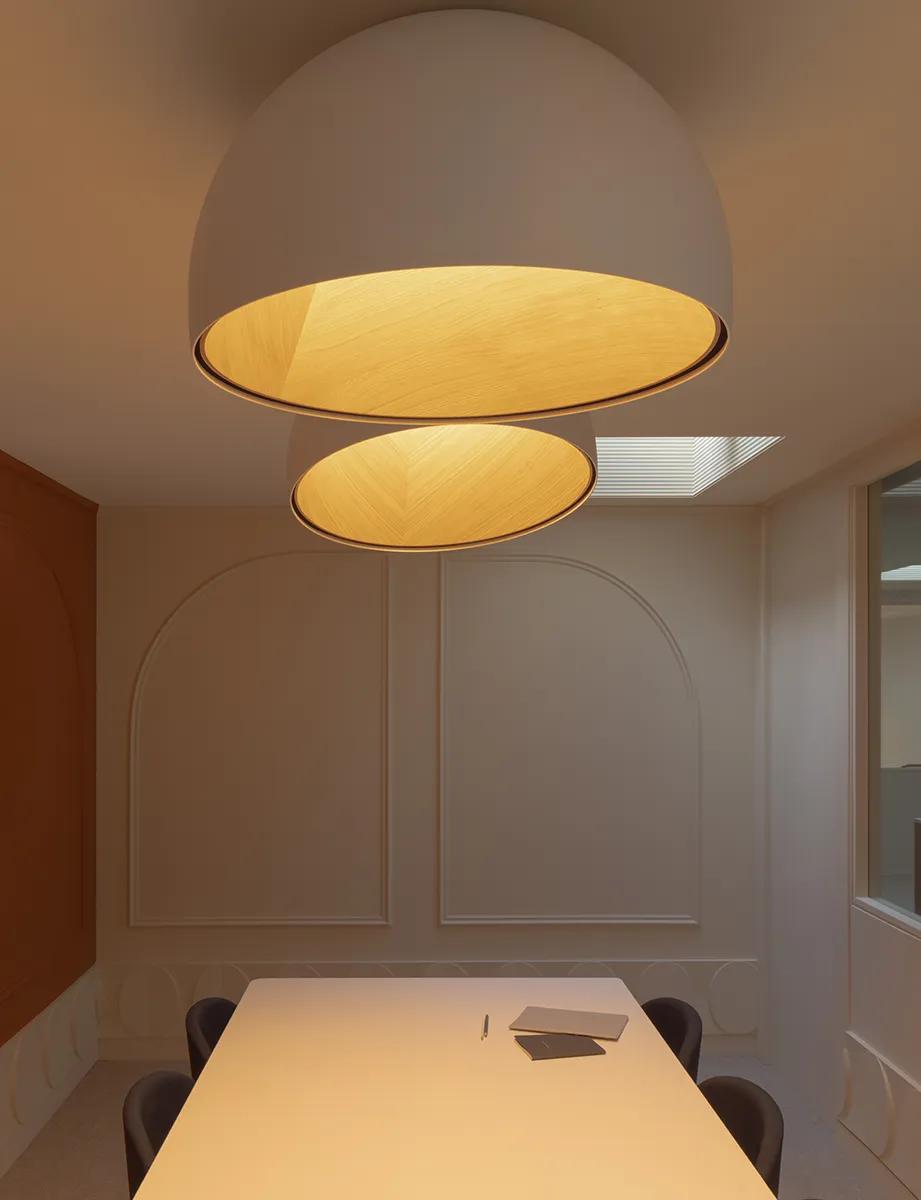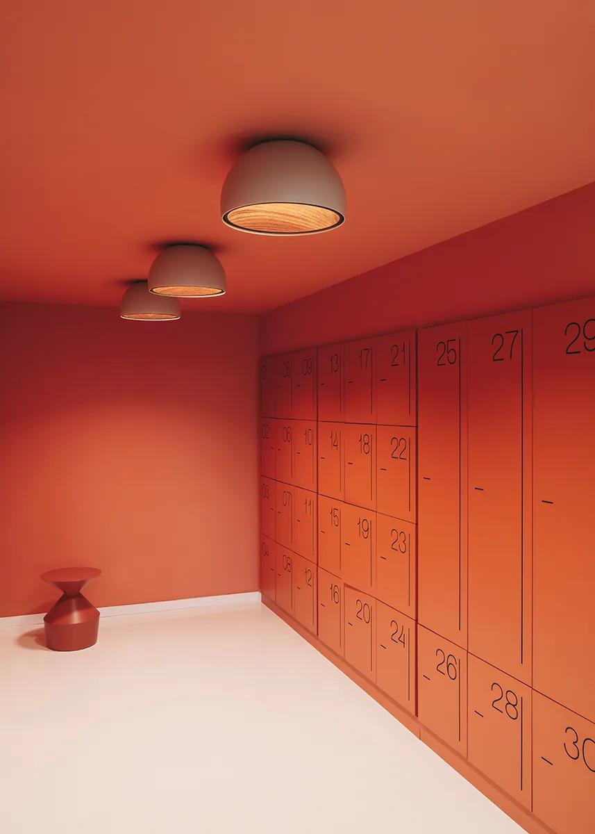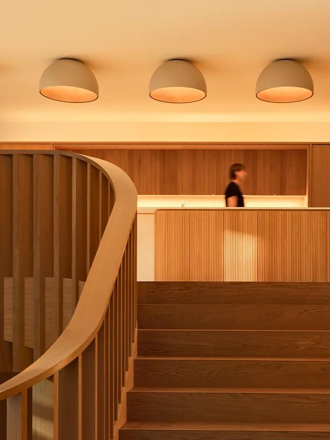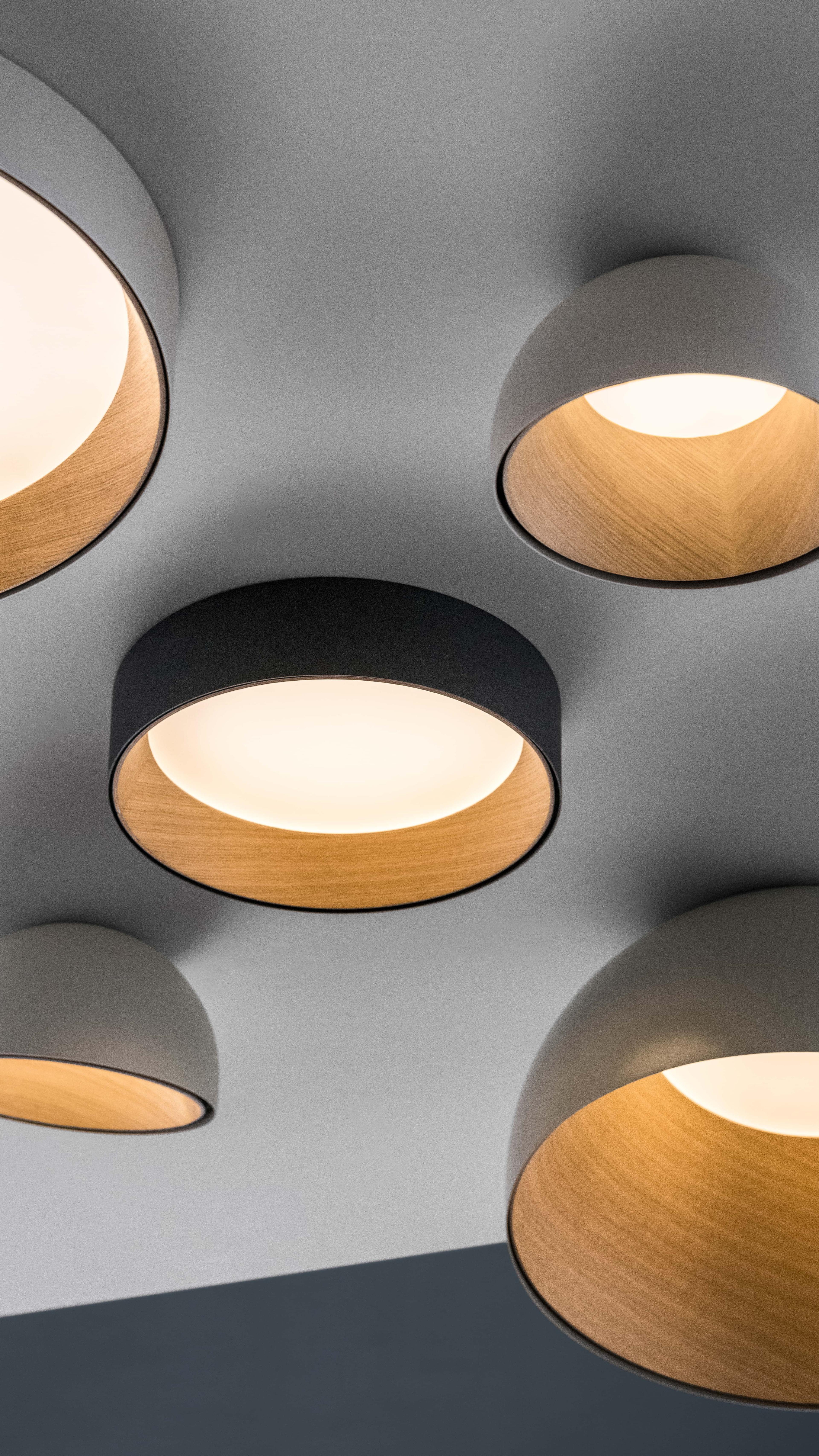 The Duo collection by Vibia reinterprets architectural lighting by integrating natural wood into its interior in each of its pieces. Its hemispherical and circular shapes, wrapped in a soft oak finish, evoke a direct connection with the natural environment, reflecting the warmth and texture of forests. Installed on the ceiling, Duo transforms spaces into interior landscapes where light and wood intertwine, creating a welcoming atmosphere that brings nature into the home.