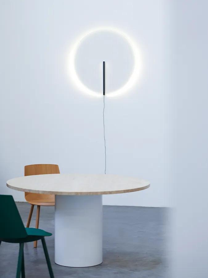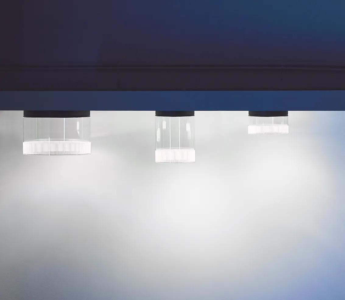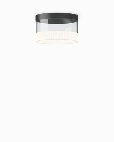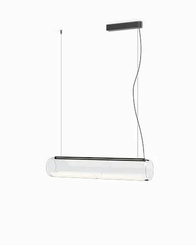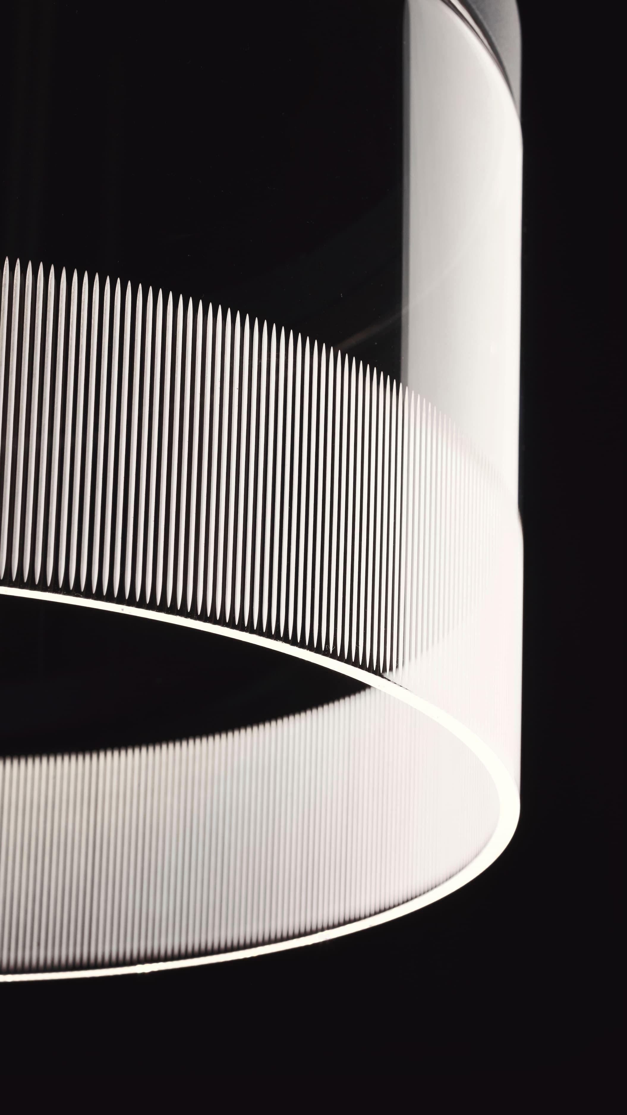 The ceiling version reveals a cylindrical glass body that seems to float beneath an opaque upper structure. The light is softly projected from within, enveloping the space with a serene atmosphere. When switched off, its transparency and material purity allow it to blend subtly into the surroundings.
