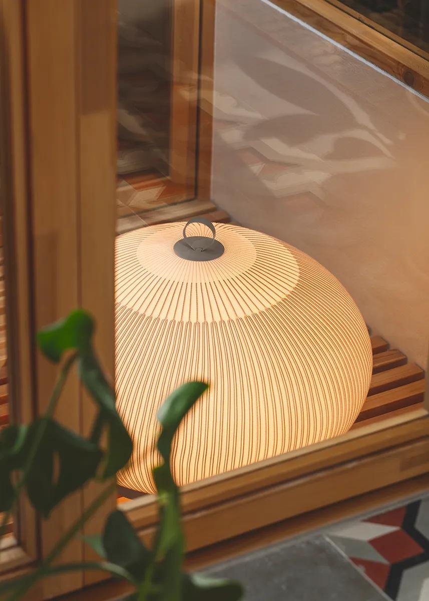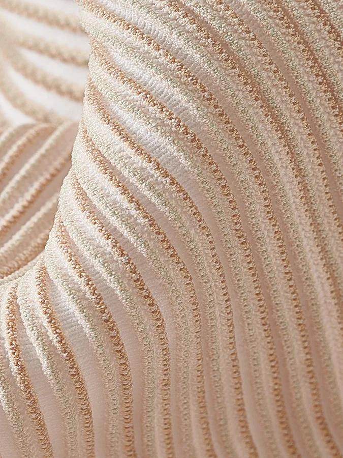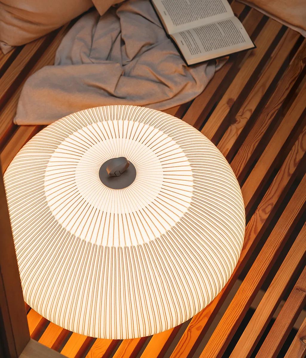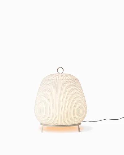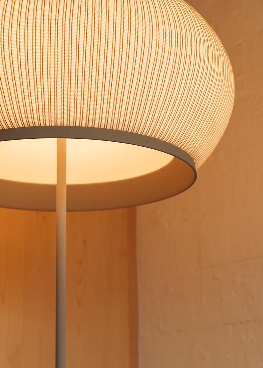 Its texture is magnetic, calling out for us to touch its surface, to feel its warmth and to keep it close. Light seeps outwards through the Knit floor lamp’s fabric and downwards through a translucent diffuser, softening its luminosity. The two-tonal stitching, together with the magical effect of the different levels of density, creates an intricate matrix of nuanced hues –from warm greys and ochres to burnished copper and rosy pink.