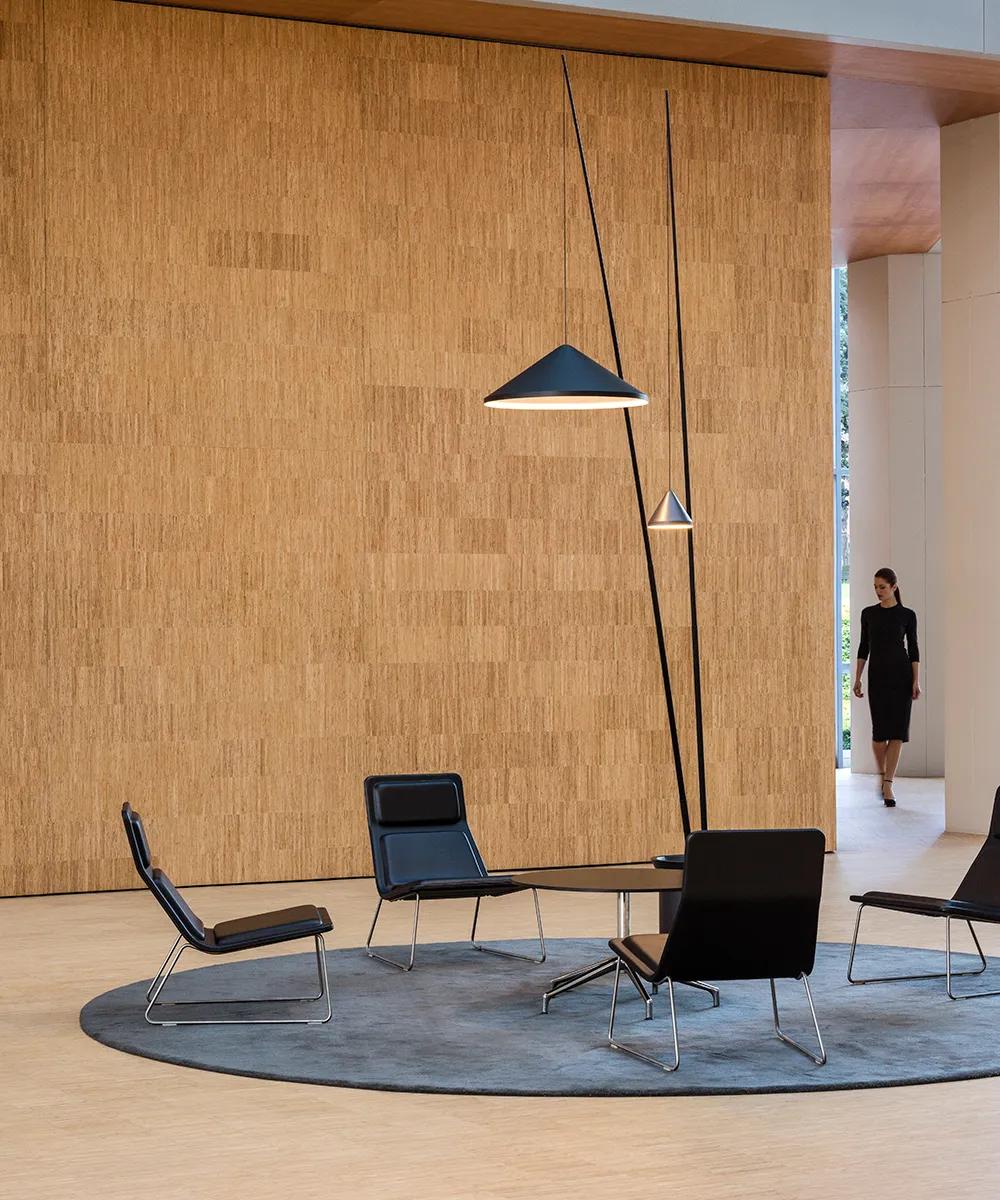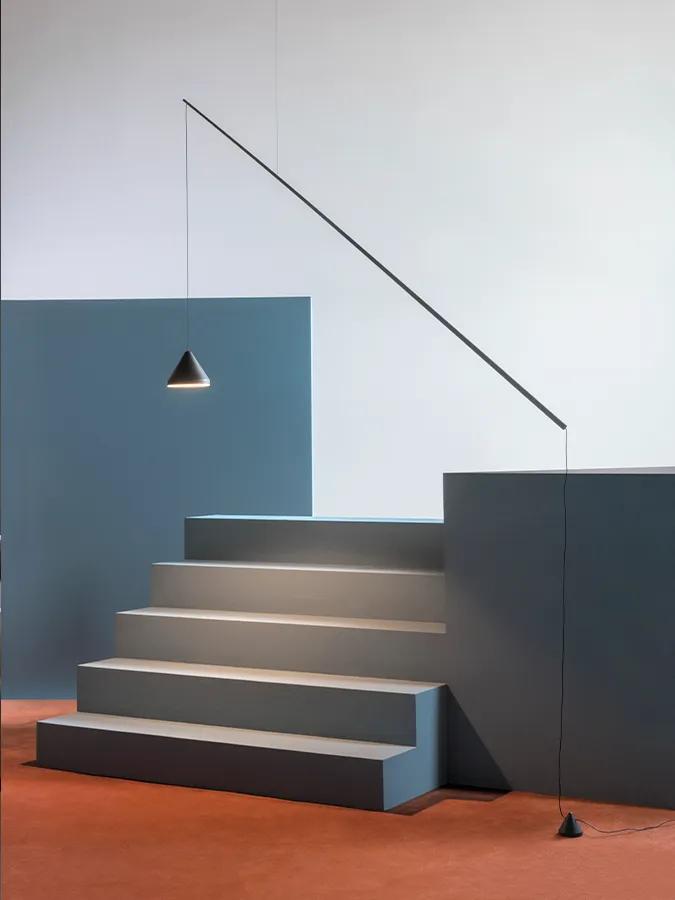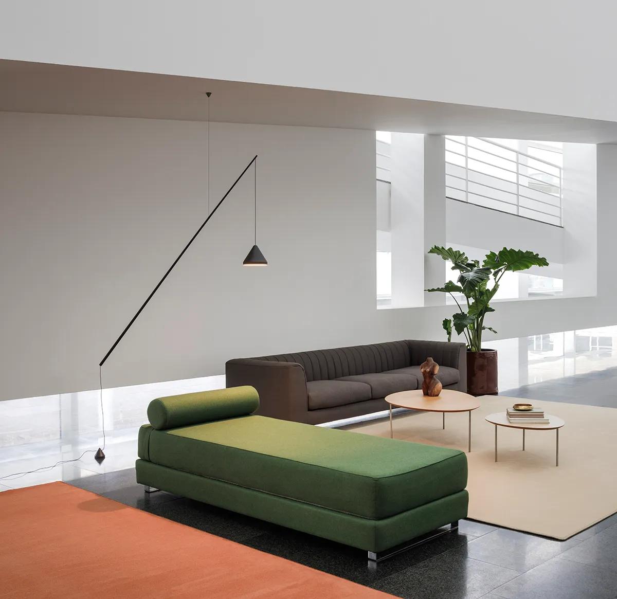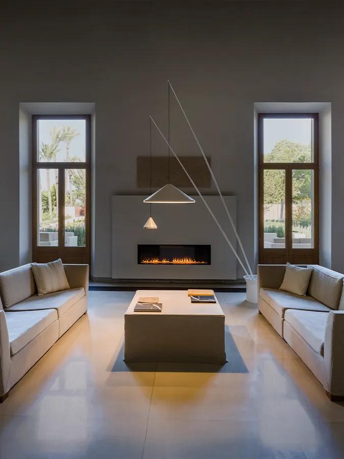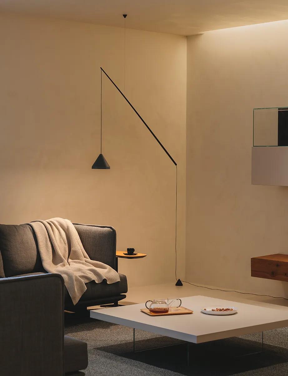 North floor redefines conventional suspension: its arm rises from the floor and casts light without requiring a ceiling installation. A smart solution for spaces with limited architectural intervention where precise illumination is needed over sofas, tables or relaxation areas. Technique and elegance combine in a light, functional gesture.