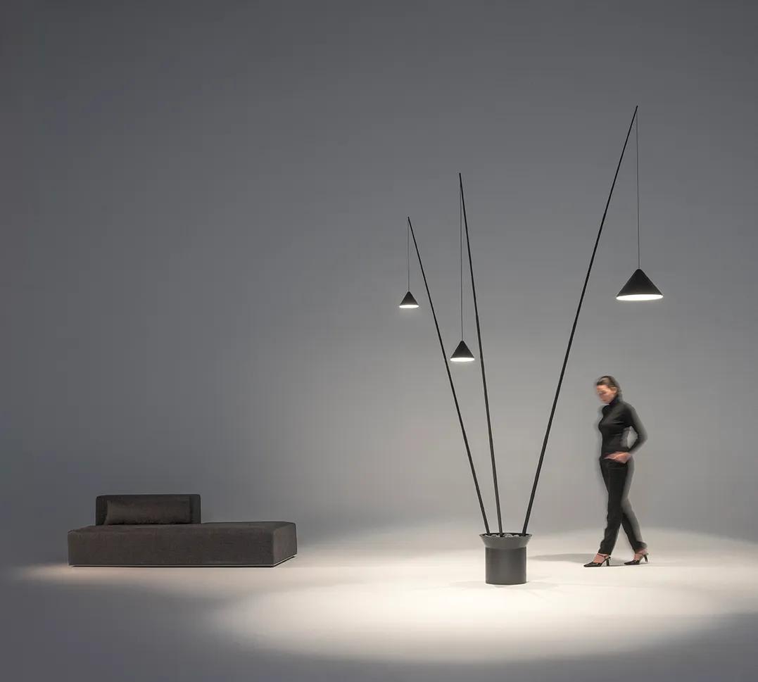 North floor with base features two or three arms emerging from a cylindrical volume, creating a light, sculptural composition. Each arm can be independently oriented, allowing the direction of the light to be adjusted to the needs of the space. This versatile configuration provides precise, controlled illumination—ideal for living areas, contract settings or scenographic compositions, where light structures the space with intention.