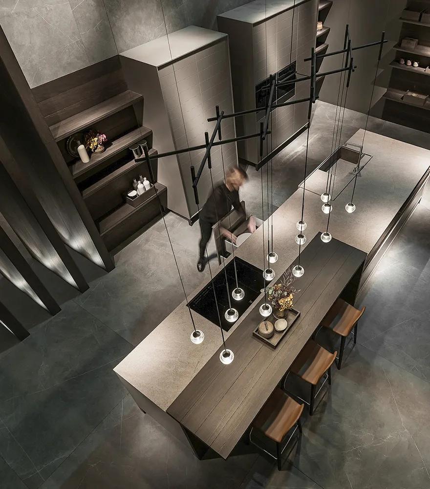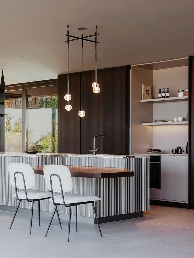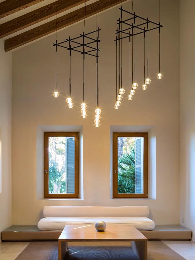 This series blends beauty and geometry into a lighting system filled with a sense of magic. Algorithm Grid combines geometric precision with sensory delicacy. The collection features configurations of glass spheres, suspended at varying heights and anchored to the ceiling by a floating tubular structure. In its Grid version, the mouth-blown glass spheres align in a perfect grid, creating a rhythmic composition that brings structure without compromising lightness. Ideal for projects requiring formal coherence and a warm atmosphere, it is a luminaire that transforms order into visual poetry.