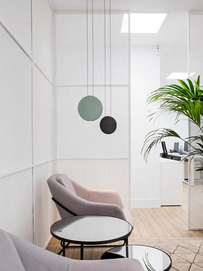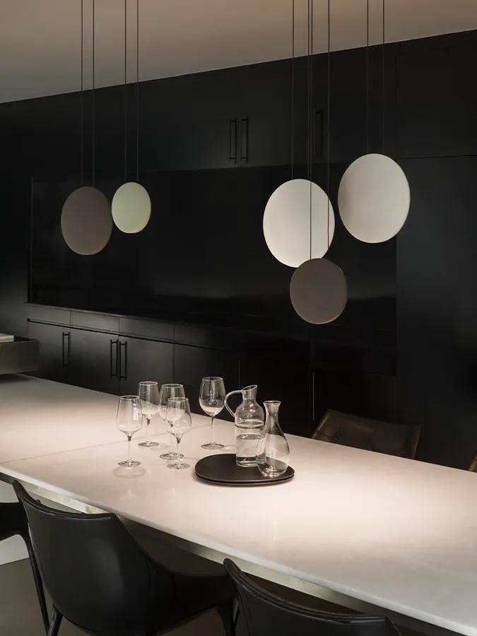 The Cosmos collection consists of pendant light clusters, flattened forms of different sizes that create an optical illusion of hanging spheres that appear to be floating in the air.