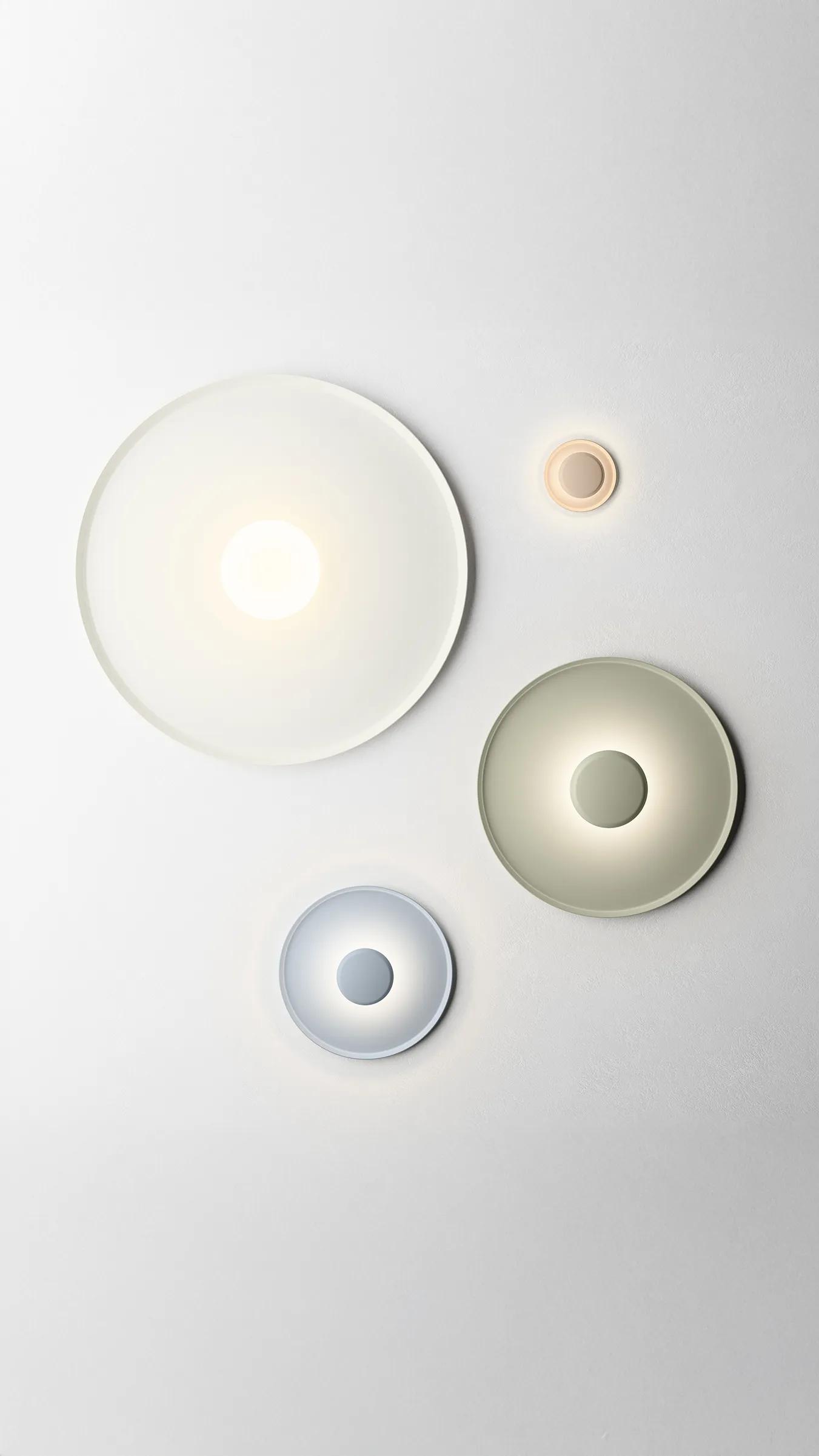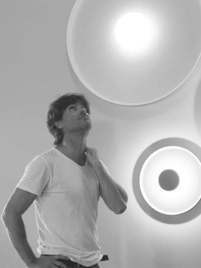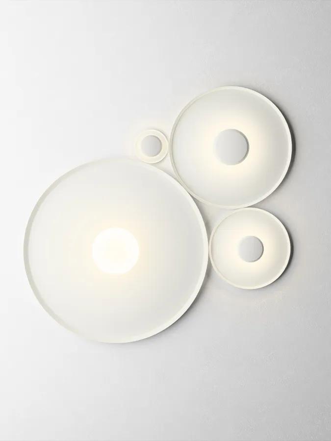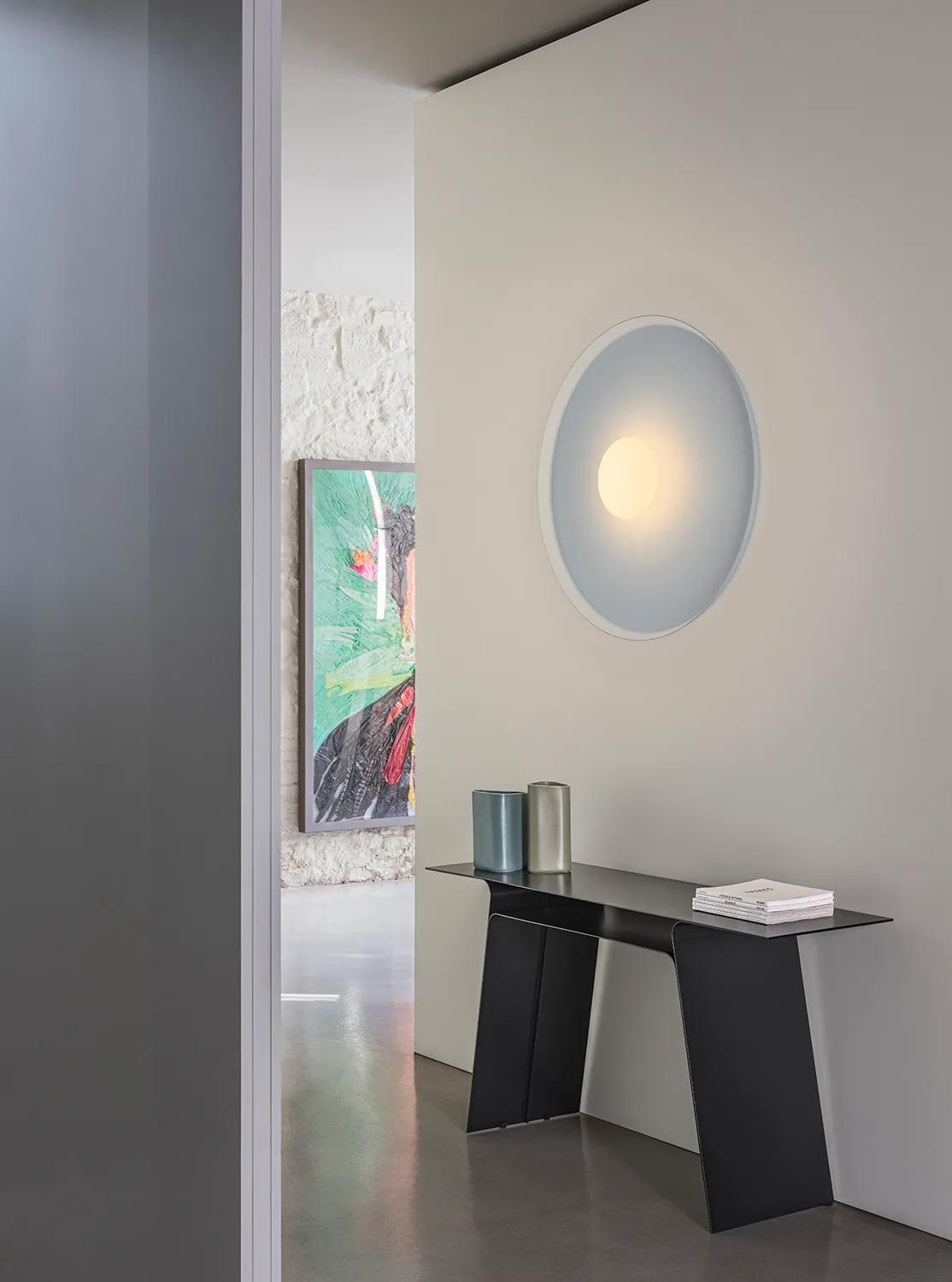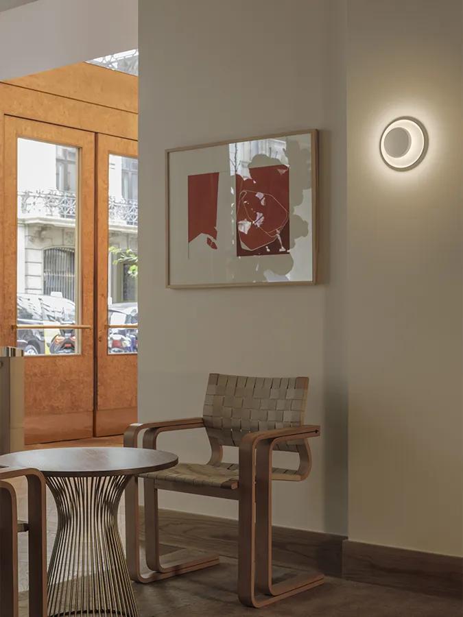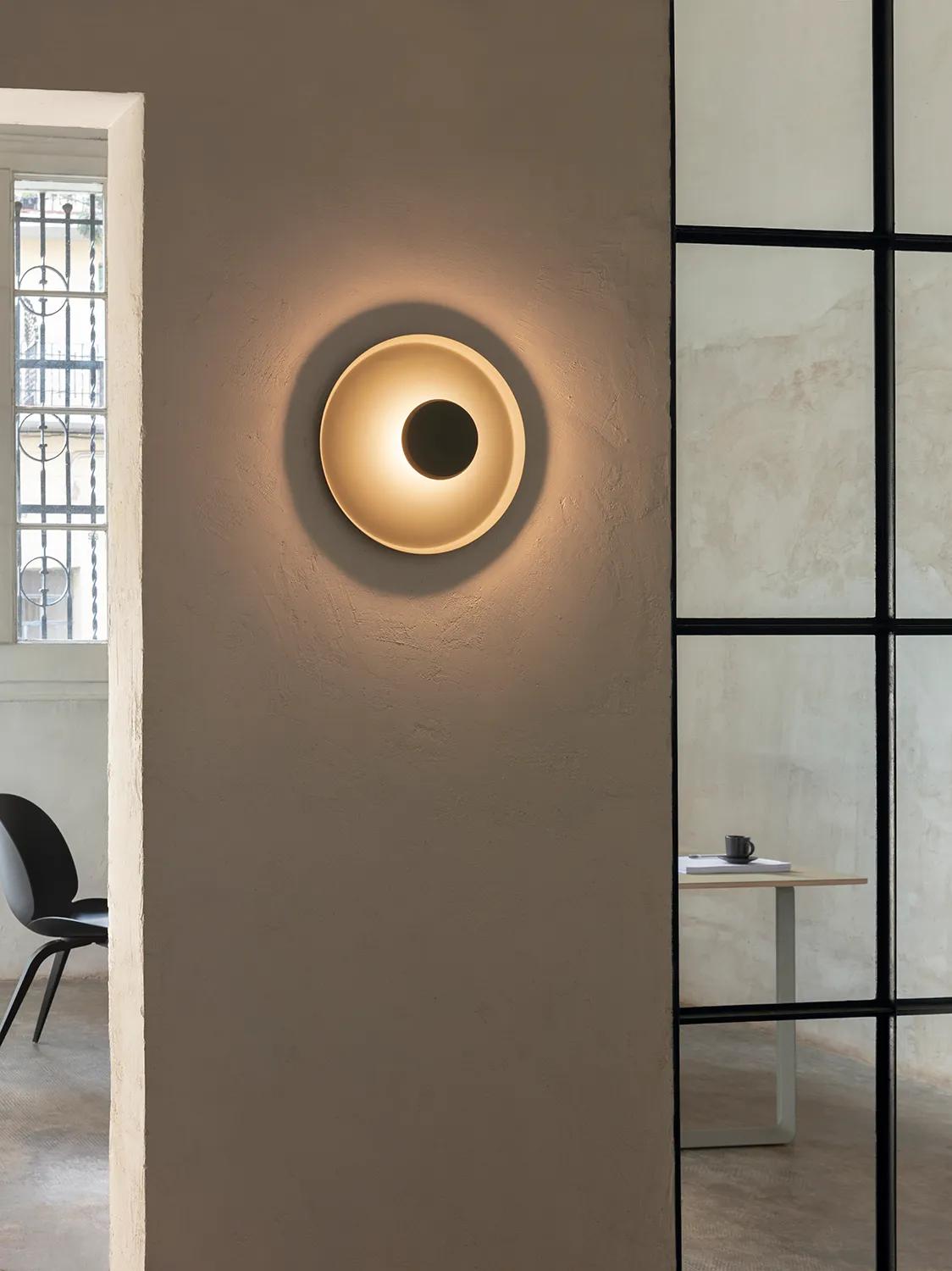 Its small central sphere reflects the light towards a larger surrounding ring generating a halo type effect of even and indirect lighting and creating a relaxed ambience. The light appears to be framed within its own diameter, its attractive and minimalist design doubles as a piece of abstract wall art.